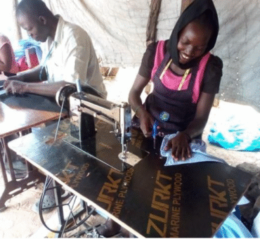 Agaku Idi and Apangu John (trainees) posing with the sofa chair